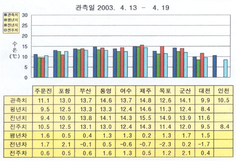 o 최근(2003. 4.13 ∼ 4.19)의 한반도 연안 표면수온은 동해 연안역에서 섭씨