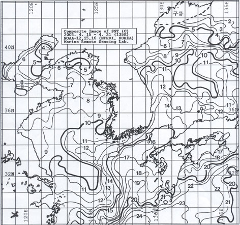 o 아래 그림은 2003년 4월 15일부터 4월 21일 까지 합성한 위성추정 표면 수온 분포도입니다. o 대화퇴근해 8∼10도, 울릉도 근해 12∼13도, 대마도 근해 15∼17, 제주도 근해 15∼17도, 이어도 근해 10∼11도, 일향초 근해 9∼10도, 어청도 근해 7∼8도 내외로 나타납니다. o「평년에 비해」수온은 대화퇴 근해 1.5도 높게, 울릉도 0.5도 높게, 대마도 근해 1도 높게, 제주도 근해 0.5도 높게, 이어도 근해 1도 낮게, 일향초 근해 1.5도 높게, 어청도 근해 1.5도 높게 나타납니다. o 수온전선대는 수온 14도를 중심으로 이어도 동쪽 100km해상∼제주도∼ 대한 해협 서수도에 걸쳐 형성됩니다. < 위의 그림을 클릭하시면 확대된 수온정보를 보실 수 있습니다 >