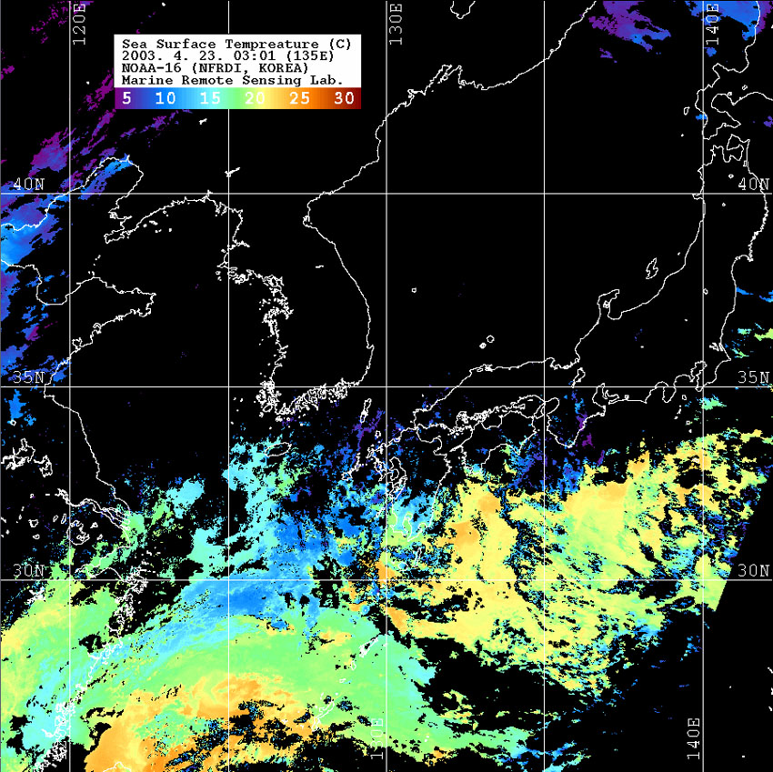 o 2003년 4월 23일 03시 01분 NOAA-16호 위성영상입니다. o 수온분포는 범례를 참고하시기 바랍니다. o 검은색은 구름과 육지를 나타냅니다.