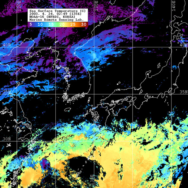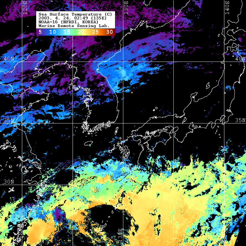 o 2003년 4월 24일 02시 49분 NOAA-16호 위성영상입니다. o 수온분포는 범례를 참고하시기 바랍니다. o 검은색은 구름과 육지를 나타냅니다.