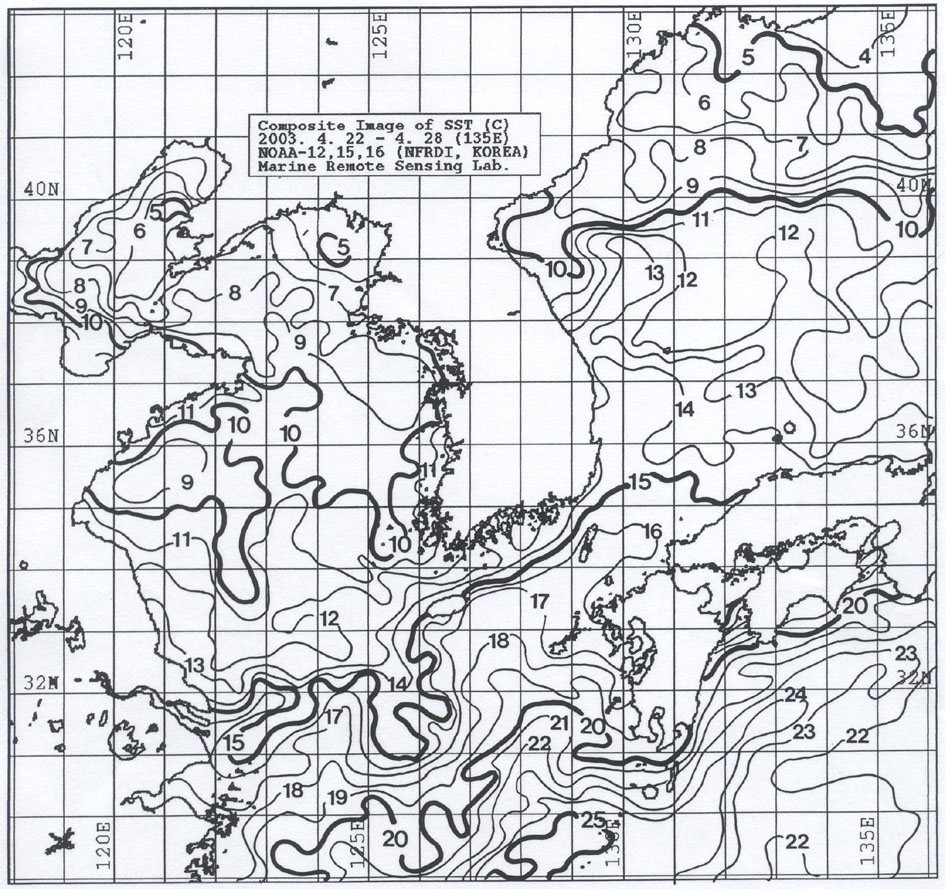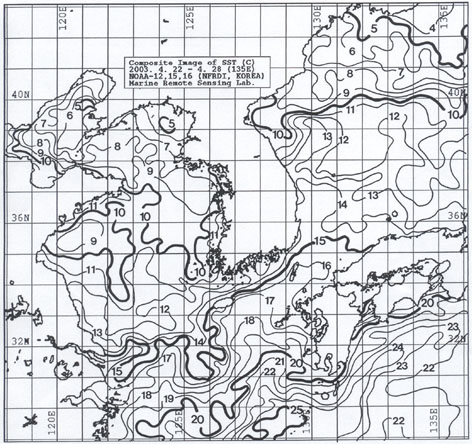 o 아래 그림은 2003년 4월 22일부터 4월 28일 까지 합성한 위성추정 표면 수온 분포도입니다. o 대화퇴근해 9∼11도, 울릉도 근해 13∼14도, 대마도 근해 16∼17, 제주도 근해 16∼18도, 이어도 근해 14∼16도, 일향초 근해 10∼11도, 어청도 근해 10∼11도 내외로 나타납니다. o「평년에 비해」수온은 대화퇴 근해 1.5도 높게, 울릉도 0.5도 높게, 대마도 및 제주도 근해 0.5도 높게, 이어도 근해 2.5도 높게, 일향초 근해 0.5도 높게, 어청도 근해 2도 높게 나타납니다. o 수온전선대는 수온 15도를 중심으로 이어도∼제주도∼대한 해협 서수도에 걸쳐 형성됩니다. < 위의 그림을 클릭하시면 확대된 수온정보를 보실 수 있습니다 >