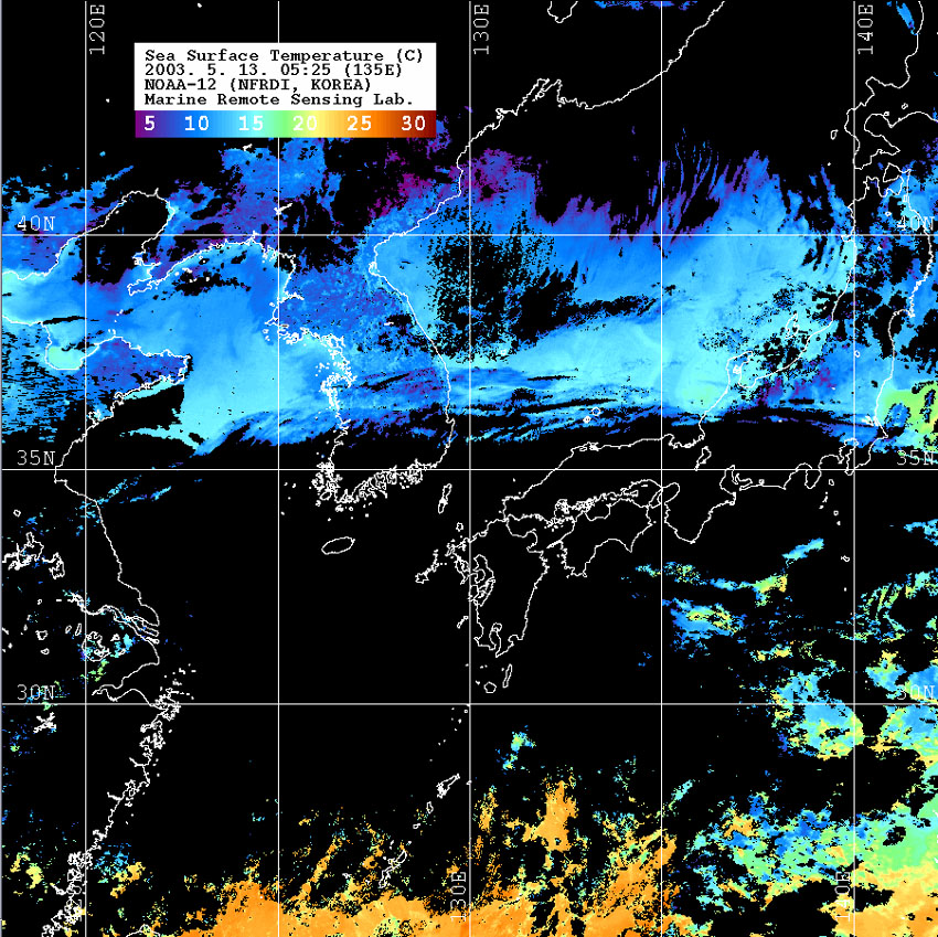 o 2003년 5월 13일 05시 25분 NOAA-12호 위성영상입니다. o 수온분포는 범례를 참고하시기 바랍니다. o 검은색은 구름과 육지를 나타냅니다.