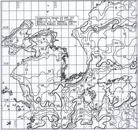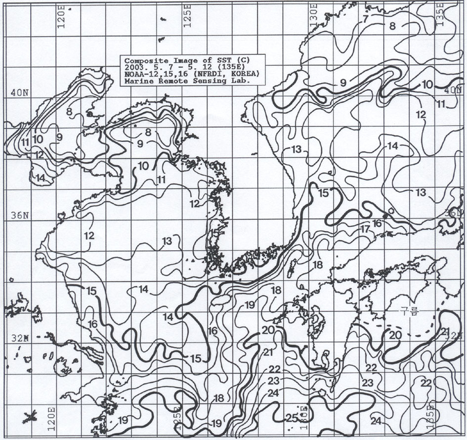 o 아래 그림은 2003년 5월 7일부터 5월 12일 까지 합성한 위성추정 표면 수온 분포도입니다. o 대화퇴근해 11∼12도, 울릉도 근해 15∼16도, 대마도 근해 17∼18, 제주도 근해 16∼18도, 이어도 근해 15∼16도, 일향초 근해 13∼14도, 어청도 근해 11∼12도 내외로 나타납니다. o「평년에 비해」수온은 대화퇴 및 울릉도 근해에서 비슷하게, 대마도 및 제주도 근해 1도 높게, 이어도 근해 비슷하게, 일향초 근해 1도 높게, 어청도 근해 2도 높게 나타납니다. o 수온전선대는 수온 16도를 중심으로 이어도 동쪽 100km해상∼제주도∼ 대한 해협 서수도에 걸쳐 형성됩니다. < 위의 그림을 클릭하시면 확대된 수온정보를 보실 수 있습니다 >