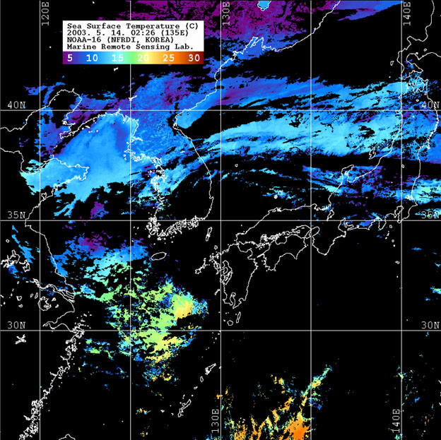 o 2003년 5월 14일 02시 26분 NOAA-16호 위성영상입니다. o 수온분포는 범례를 참고하시기 바랍니다. o 검은색은 구름과 육지를 나타냅니다.