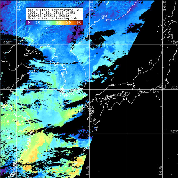 o 2003년 5월 19일 06시 19분 NOAA-12호 위성영상입니다. o 수온분포는 범례를 참고하시기 바랍니다. o 검은색은 구름과 육지를 나타냅니다.
