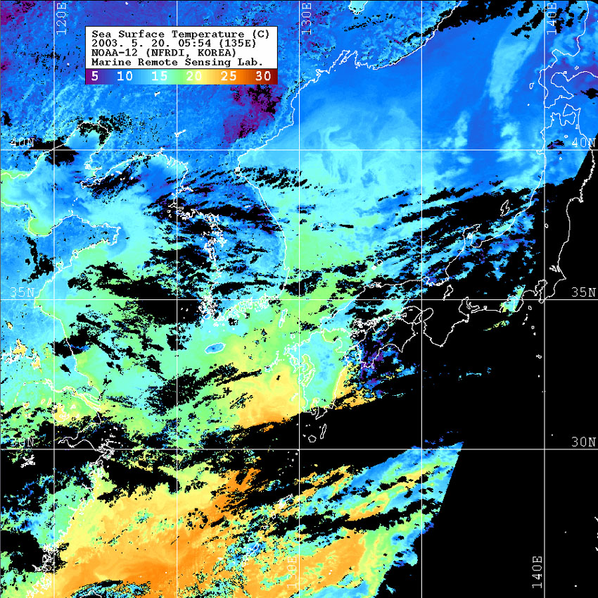 o 2003년 5월 20일 05시 54분 NOAA-12호 위성영상입니다. o 수온분포는 범례를 참고하시기 바랍니다. o 검은색은 구름과 육지를 나타냅니다.