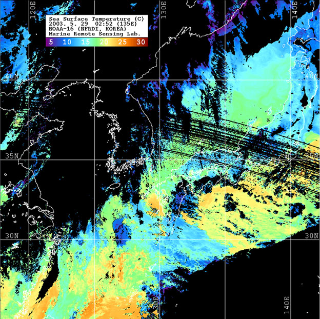 o 2003년 5월 29일 02시 52분 NOAA-16호 위성영상입니다. o 수온분포는 범례를 참고하시기 바랍니다. o 검은색은 구름과 육지를 나타냅니다.