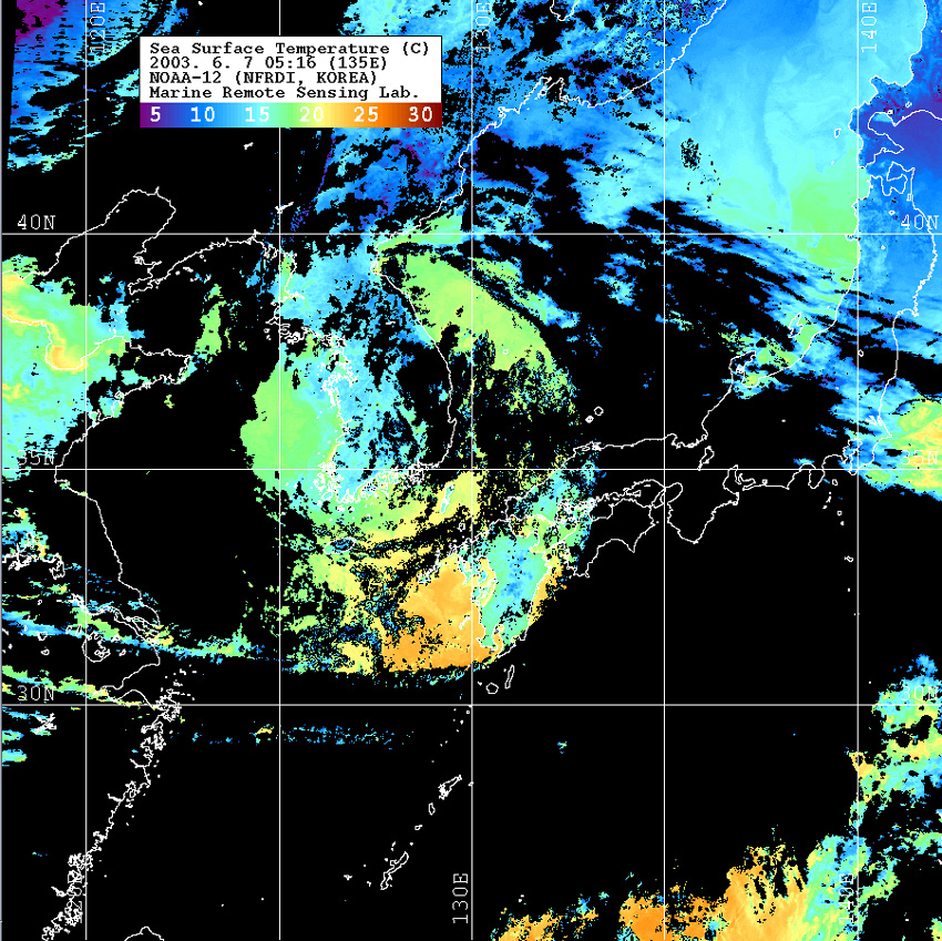 o 2003년 6월 7일 05시 16분 NOAA-12호 위성영상입니다. o 수온분포는 범례를 참고하시기 바랍니다. o 검은색은 구름과 육지를 나타냅니다.
