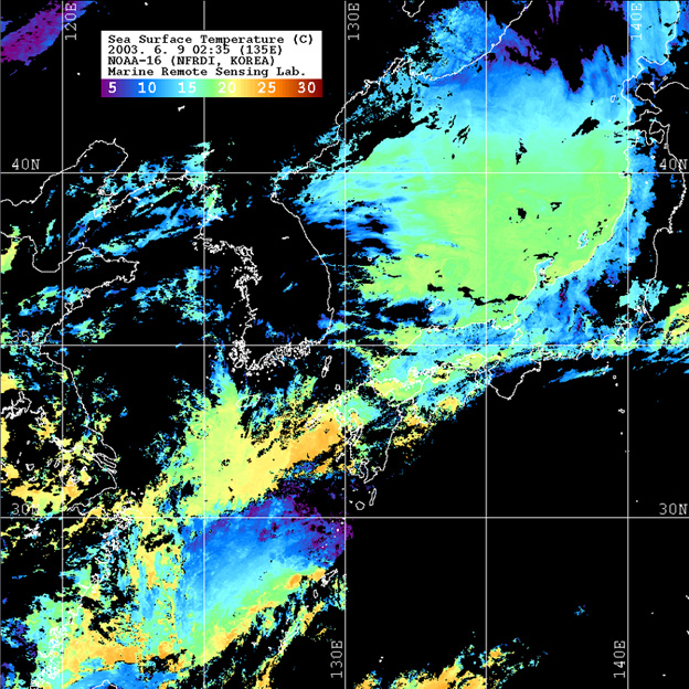 o 2003년 6월 9일 02시 35분 NOAA-16호 위성영상입니다. o 수온분포는 범례를 참고하시기 바랍니다. o 검은색은 구름과 육지를 나타냅니다.