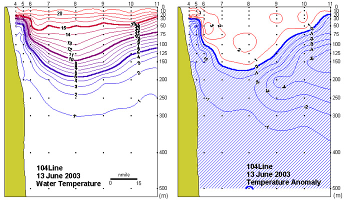 104선(죽변 동방)의 수직수온분포도 및 평년편차도 입니다.