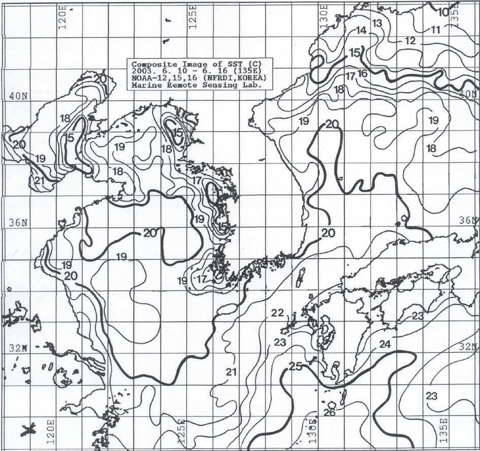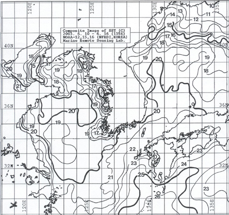 o 아래 그림은 2003년 6월 10일부터 6월 16일 까지 합성한 위성추정 표면 수온 분포도입니다. o 대화퇴 근해 17∼19도, 울릉도 근해 20∼21도, 대마도 근해 21∼22도, 제주도 근해 20∼21도, 이어도 근해 20∼21도, 일향초 근해 18∼19도, 어청도 근해 16∼18도로 나타납니다. o「평년에 비해」수온은 대화퇴, 울릉도 및 대마도 근해 1도 높게, 제주도 근해 0.5도 낮게, 이어도 근해 1도 낮게, 일향초 근해 비슷하게, 어청도 근해에서 1도 낮게 나타납니다. o 수온전선대는 수온 18도를 중심으로 서해 남부의 진도 연근해역 및 서해 중부의 태안반도 연근해역에서 형성됩니다. < 위의 그림을 클릭하시면 확대된 수온정보를 보실 수 있습니다 >