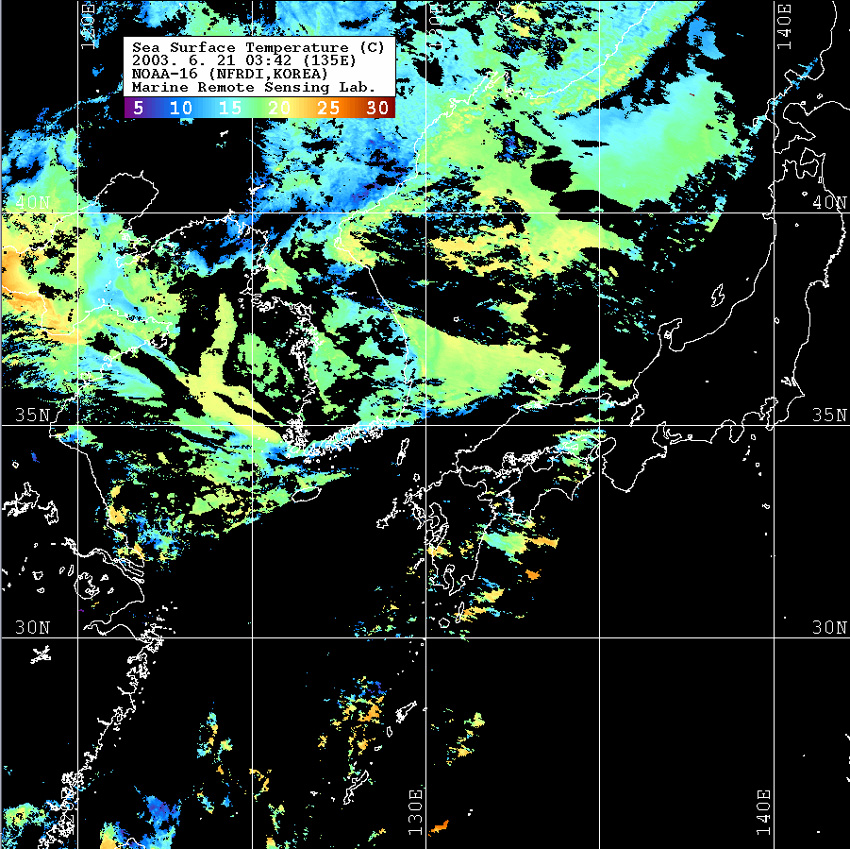 o 2003년 6월 21일 03시 42분 NOAA-16호 위성영상입니다. o 수온분포는 범례를 참고하시기 바랍니다. o 검은색은 구름과 육지를 나타냅니다.