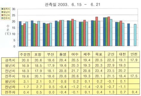 o 최근(2003. 6.15 ∼ 6.21)의 한반도 연안 표면수온은 동해 연안역에서