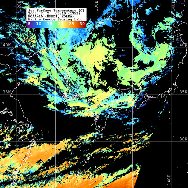 o 2003년 7월 2일 03시 19분 NOAA-16호 위성영상입니다. o 수온분포는 범례를 참고하시기 바랍니다. o 검은색은 구름과 육지를 나타냅니다.