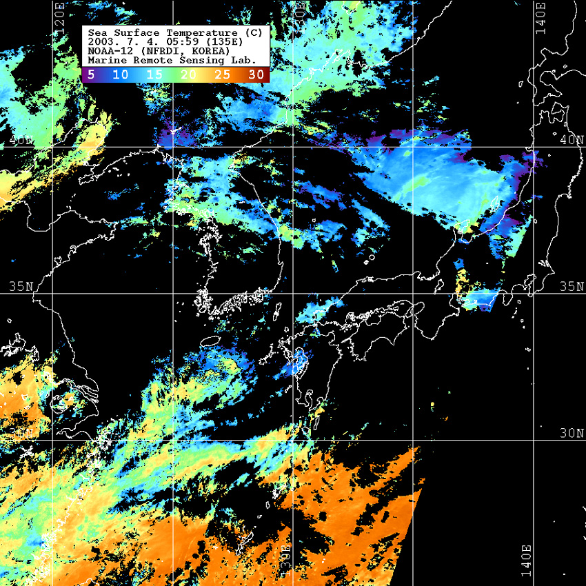 o 2003년 7월 4일 05시 59분 NOAA-12호 위성영상입니다. o 수온분포는 범례를 참고하시기 바랍니다. o 검은색은 구름과 육지를 나타냅니다.