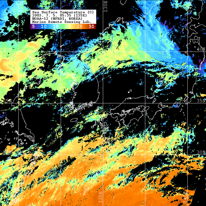 o 2003년 7월 5일 05시 35분 NOAA-12호 위성영상입니다. o 수온분포는 범례를 참고하시기 바랍니다. o 검은색은 구름과 육지를 나타냅니다.