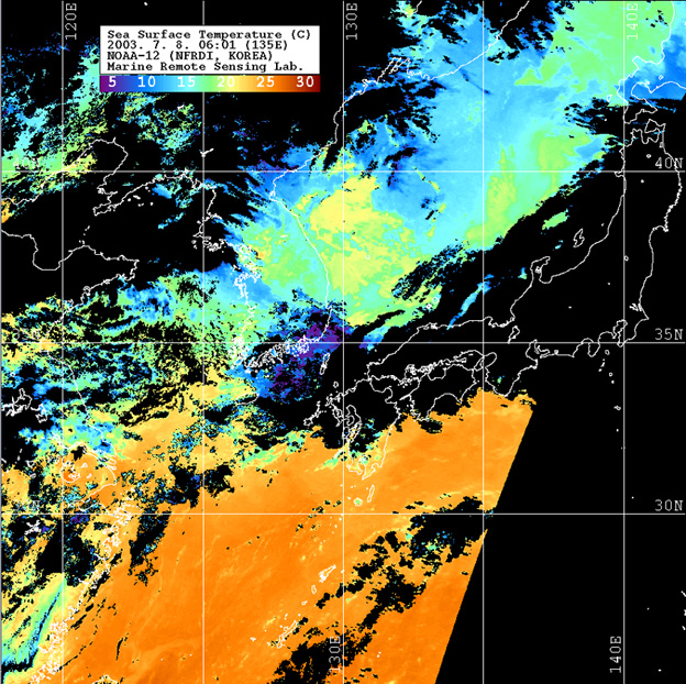 o 2003년 7월 8일 06시 01분 NOAA-12호 위성영상입니다. o 수온분포는 범례를 참고하시기 바랍니다. o 검은색은 구름과 육지를 나타냅니다.