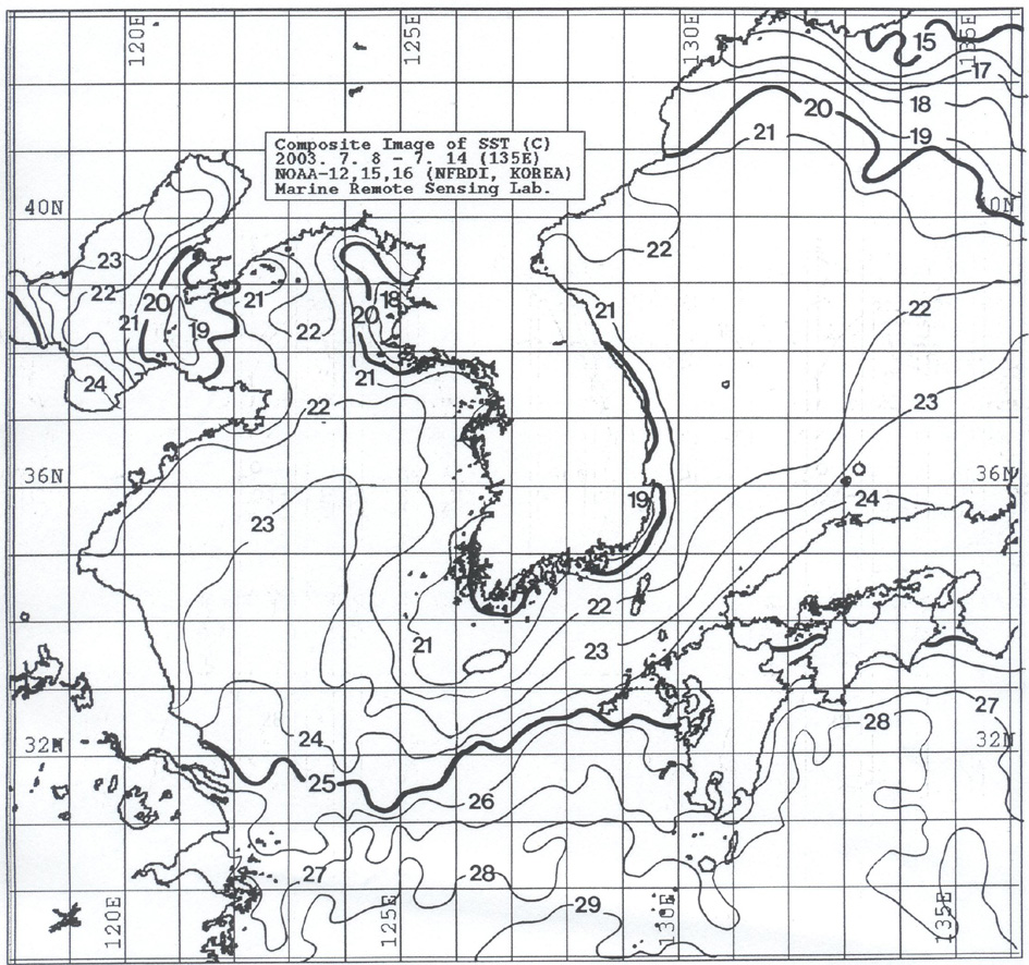 o 수온전선대는 수온 19도를 중심으로 동해 남부 연안역에서 형성되고 있습니다.