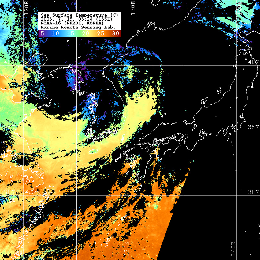 o 2003년 7월 19일 03시 28분 NOAA-16호 위성영상입니다. o 수온분포는 범례를 참고하시기 바랍니다. o 검은색은 구름과 육지를 나타냅니다.