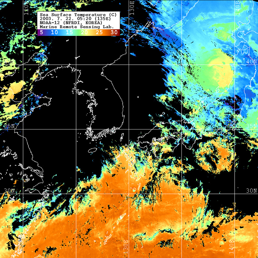 o 2003년 7월 22일 05시 20분 NOAA-12호 위성영상입니다. o 수온분포는 범례를 참고하시기 바랍니다. o 검은색은 구름과 육지를 나타냅니다.