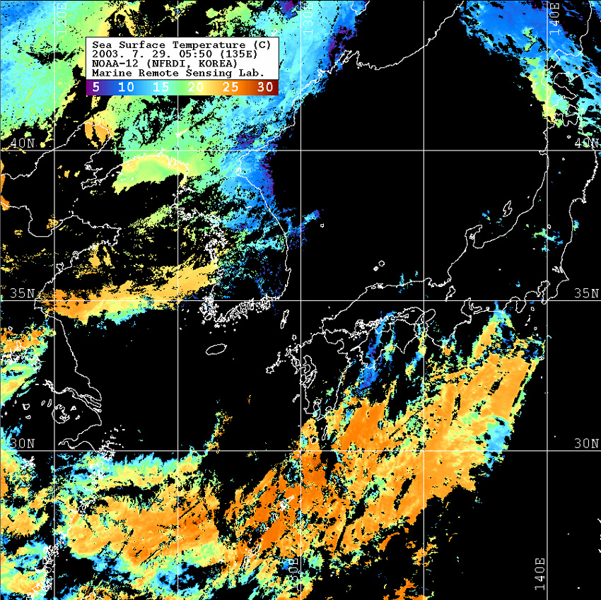 o 2003년 7월 29일 05시 50분 NOAA-12호 위성영상입니다. o 수온분포는 범례를 참고하시기 바랍니다. o 검은색은 구름과 육지를 나타냅니다.