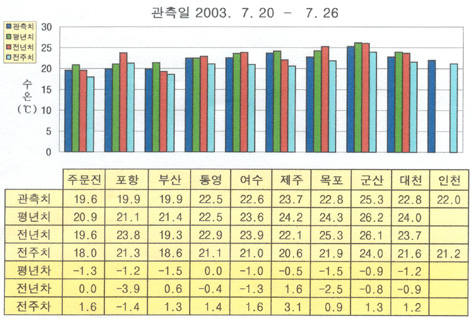 o 최근(2003. 7.20∼ 7.26)의 한반도 연안 표면수온은 동해 연안역에서 섭씨 20도,