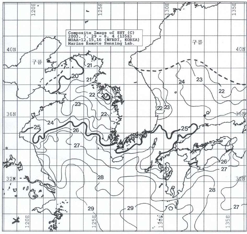 o 아래 그림은 2003년 7월 29일부터 8월 4일 까지 합성한 위성추정 표면 수온 분포도입니다. o 울릉도 근해 24∼25도, 대마도 근해 25∼26도, 제주도 근해 25∼27도, 이어도 근해 28∼29도, 일향초 근해 26∼27도, 어청도 근해 21∼22도 내외로 나타납니다. o「평년에 비해」수온은 울릉도 근해 비슷하게, 대마도 근해 1도 낮게, 제주도 근해 0.5도 낮게, 이어도 근해 및 일향초 근해 1도 높게, 어청도 근해에서 2도 낮게 나타납니다. o 수온전선대는 수온 26도를 중심으로 황해 남부연안 해역에서 형성됩니다. < 위의 그림을 클릭하시면 확대된 수온정보를 보실 수 있습니다 >