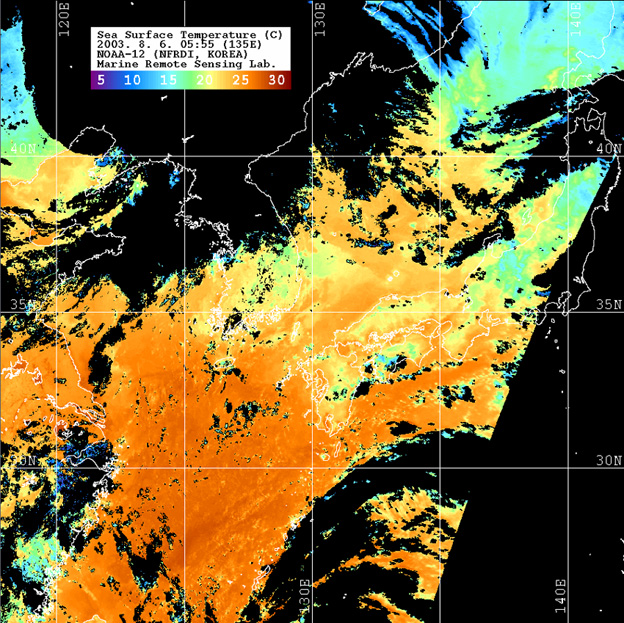 o 2003년 8월 6일 05시 55분 NOAA-12호 위성영상입니다. o 수온분포는 범례를 참고하시기 바랍니다. o 검은색은 구름과 육지를 나타냅니다.
