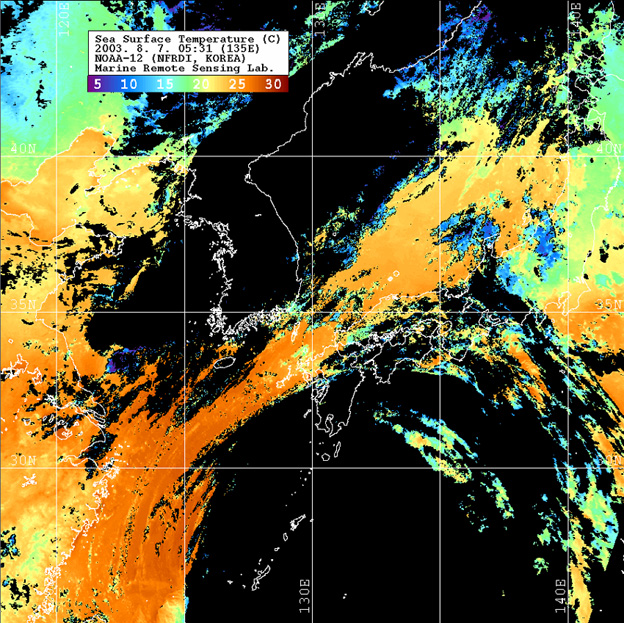 o 2003년 8월 7일 05시 31분 NOAA-12호 위성영상입니다. o 수온분포는 범례를 참고하시기 바랍니다. o 검은색은 구름과 육지를 나타냅니다.