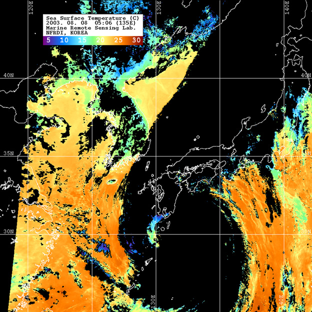 o 2003년 8월 8일 05시 06분 NOAA-12호 위성영상입니다. o 수온분포는 범례를 참고하시기 바랍니다. o 검은색은 구름과 육지를 나타냅니다.