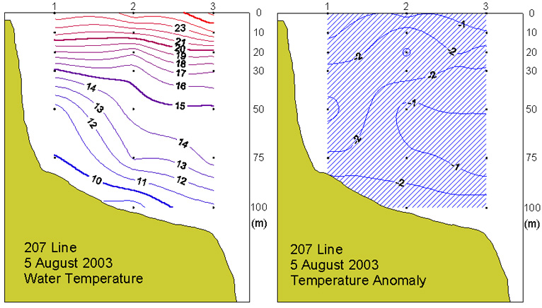 207선(부산 남동방)의 수직수온분포도 및 평년편차도 입니다.