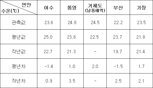 o 작년에 비해 오늘 수온은 여수 1도, 통영 3.5도, 부산 2.5도, 기장 2도