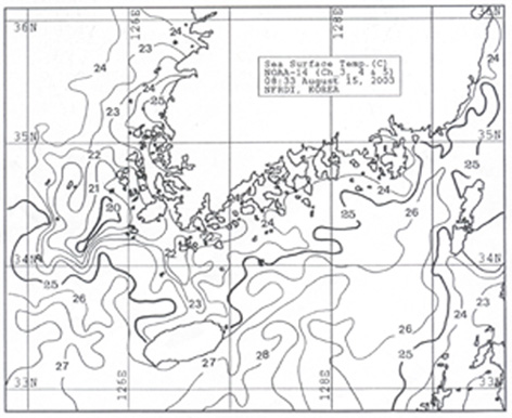 o 2003년 8월 15일 08시 33분 현재 NOAA 위성이 관측한 한반도 남부 연근해역