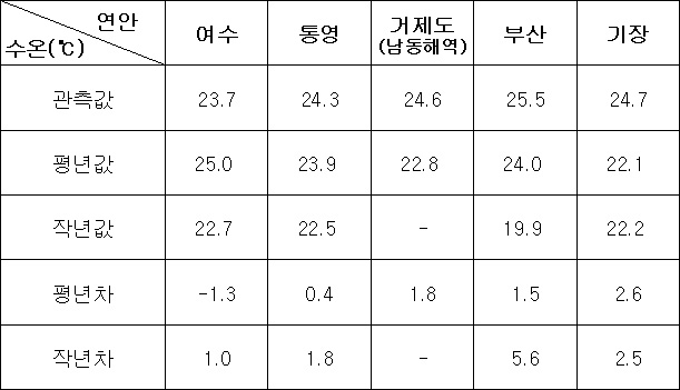 ㅇ 평년에 비해 오늘 수온은 여수 1.5도 낮게, 통영 0.5도 높게, 거제도 2도 높게,