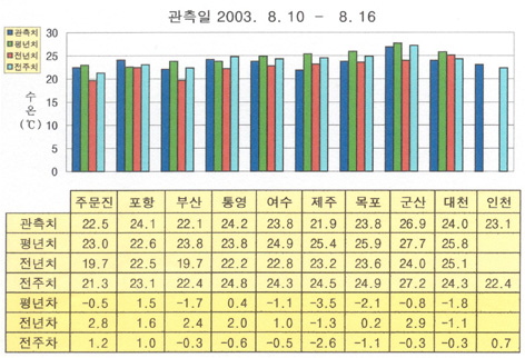 o 최근(2003. 8.10∼ 8.16)의 한반도 연안 표면수온은 동해 연안역에서 섭씨