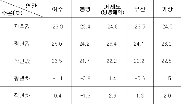 o 작년에 비해 오늘 수온은 여수 0.5도 높게, 통영 1도 낮게, 거제도 2.5도 높게,