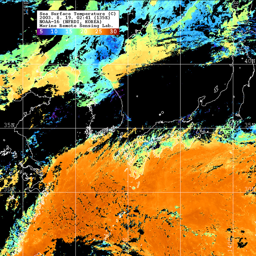 o 2003년 8월 19일 02시 41분 NOAA-16호 위성영상입니다. o 수온분포는 범례를 참고하시기 바랍니다. o 검은색은 구름과 육지를 나타냅니다.