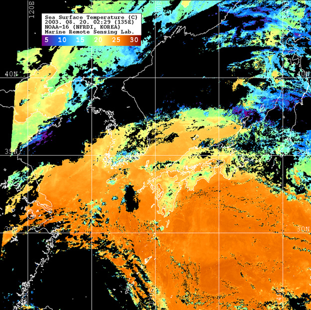 o 2003년 8월 20일 02시 29분 NOAA-16호 위성영상입니다. o 수온분포는 범례를 참고하시기 바랍니다. o 검은색은 구름과 육지를 나타냅니다.