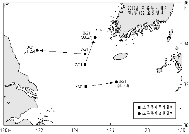 ㅇ 부산대학교 이동규 교수가 제공한 표류부이의 금일 위치 및 염분자료입니다.