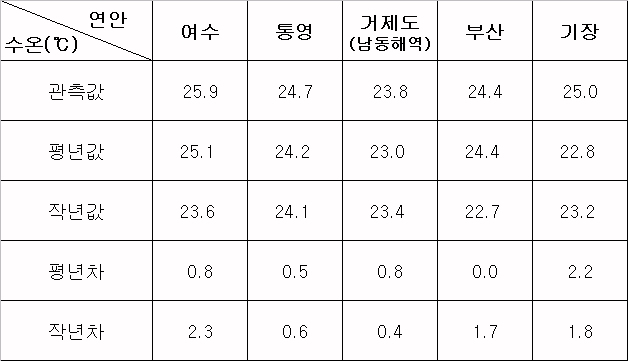 o 2003년 8월 22일 10시 현재 관측된 연안수온은 여수 섭씨 25.9도, 통영 24.7도,