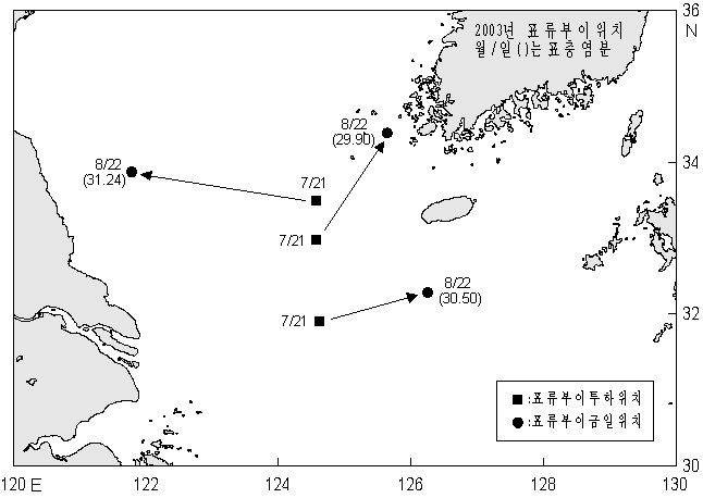 ㅇ 부산대학교 이동규 교수가 제공한 표류부이의 금일 위치 및 염분자료입니다.