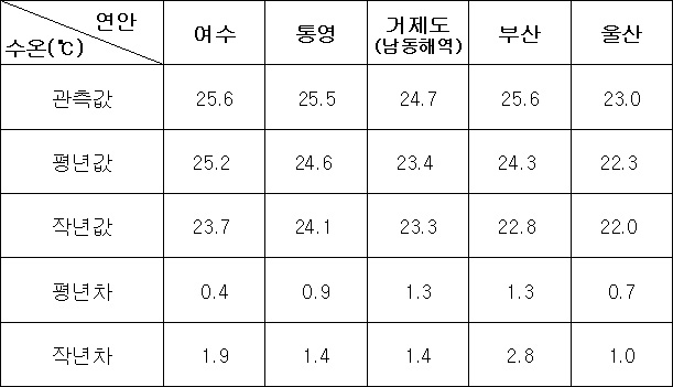 o 평년에 비해 오늘 수온은 여수 0.5도 높게, 통영 1도 높게, 거제도 및 부산 1.5도