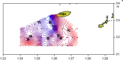 o 염분은 25.5∼32.0의 범위로 제주 남서부 약 50㎞ 해역에서 염분 농도