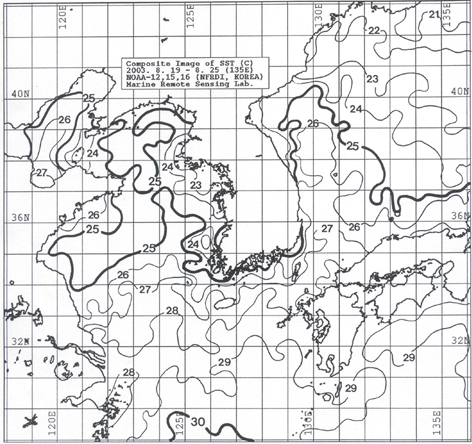 o 대화퇴 근해 22∼24도, 울릉도 근해 25∼26도, 대마도 근해 26∼27도, 제주도 근해