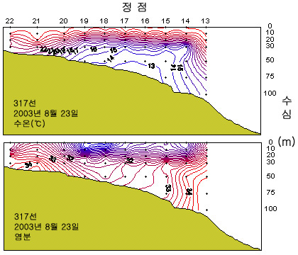 o 2003년 8월 23일 국립수산과학원 해양연구과에서 조사한 317선(동중 국해 북부해역)의 연직수온