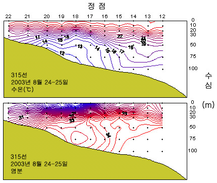 o 2003년 8월 24∼25일 국립수산과학원 해양연구과에서 조사한 315선(동중국해 북부해역)의 연직수온 분포도입니다.