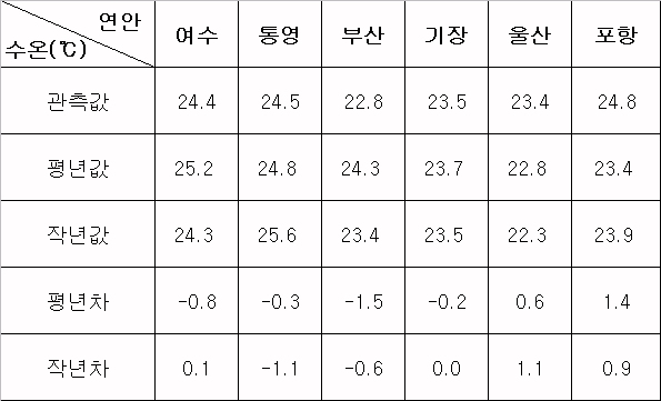 o 평년에 비해 오늘 수온은 여수, 통영, 부산 0.5∼1.5도 낮게, 기장 비슷하게,