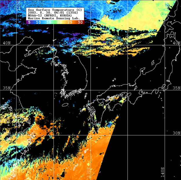 o 2003년 8월 30일 06시 01분 NOAA-12호 위성영상입니다. o 수온분포는 범례를 참고하시기 바랍니다. o 검은색은 구름과 육지를 나타냅니다.