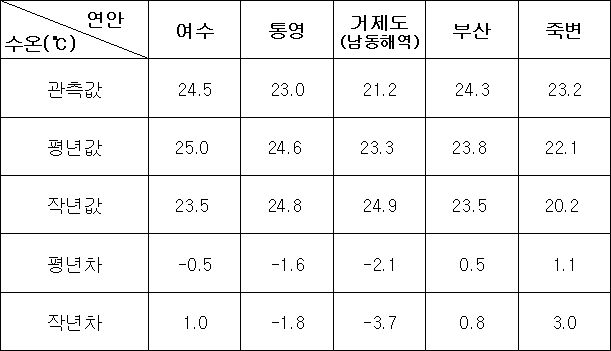 o 작년에 비해 오늘 수온은 여수 1도 높게, 통영 2도 낮게, 거제도 남동해역