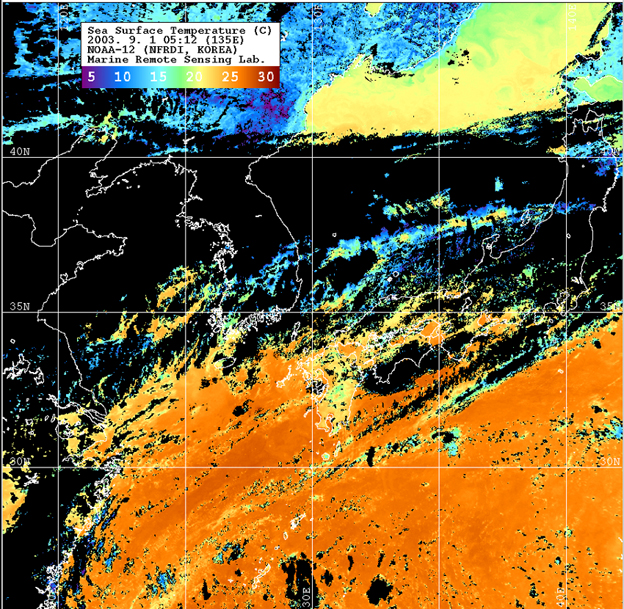 o 2003년 9월 1일 05시 12분 NOAA-12호 위성영상입니다. o 수온분포는 범례를 참고하시기 바랍니다. o 검은색은 구름과 육지를 나타냅니다.